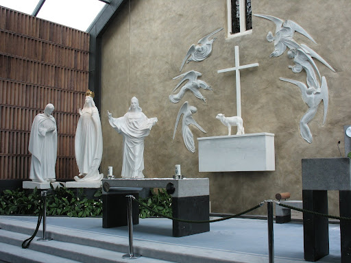 On her right was St. Joseph, head bowed and turned slightly towards her as if paying her his respects. He wore white robes.